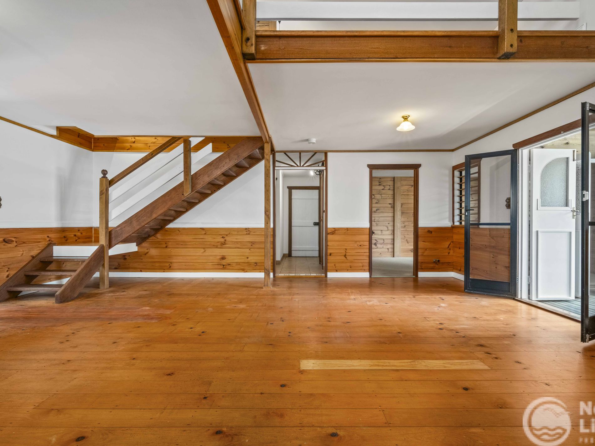 The floor plan is both practical and inviting, with the main bedroom opening directly to the veranda via french doors. Upstairs, the spacious mezzanine level includes a dividing wall, making it ideal for use as two bedrooms or as a flexible bedroom and living space. Solid timber stairs and beautiful hardwood details feature throughout, adding to the home’s timeless appeal.